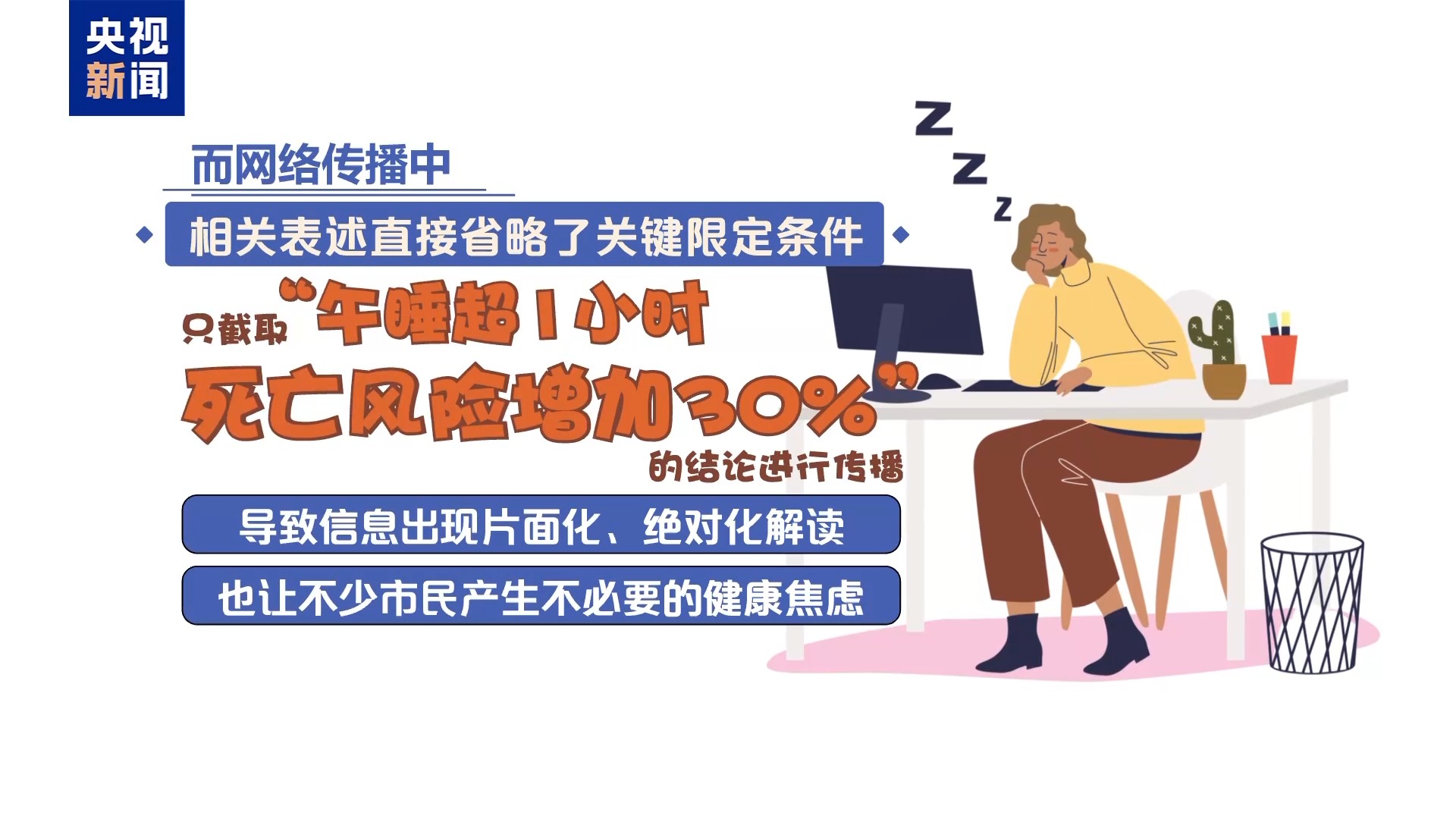 而网络传播中,相关表述直接省略了关键限定条件,只截取“午睡超1小时死亡风险增加30%”的结论进行传播,导致信息出现片面化、绝对化解读,也让不少市民产生不必要的健康焦虑。